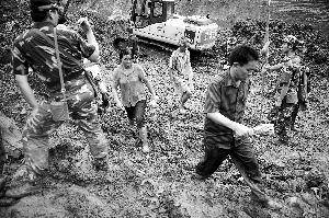 負(fù)責(zé)挖掘的武警交通直屬工程部的周偉表示,為了確保安全,避免次生災(zāi)害,大型挖掘機(jī)的挖掘工作到下午四點(diǎn)左右才開(kāi)始。他說(shuō),為了保證遺體的完整,他們挖掘的時(shí)候都會(huì)非常小心。在現(xiàn)場(chǎng),由于垮塌的直線距離幾百米,幾臺(tái)挖掘機(jī)分層次挖掘。挖出一大鏟泥土后,從高處落下,看是否有遺體存在。