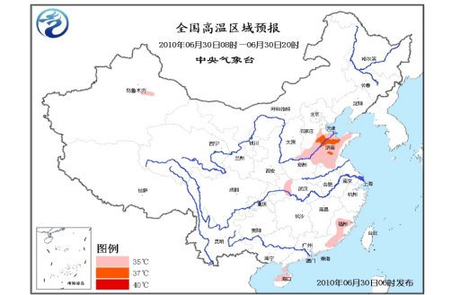 中新網(wǎng)6月30日電 據(jù)中國氣象局網(wǎng)站消息,中央氣象臺(tái)今日6時(shí)繼續(xù)發(fā)布高溫藍(lán)色預(yù)警,預(yù)計(jì),今天白天,黑龍江、山西等地的高溫天氣將暫時(shí)告一段落,河北南部、河南東部和北部、山東大部、安徽北部、江蘇西北部、湖北西部、福建中南部的部分地區(qū)、廣東東部、海南北部等地將會(huì)出現(xiàn)35~37℃的高溫。另外,預(yù)計(jì)未來幾天,中國主要降雨帶將明顯北抬。