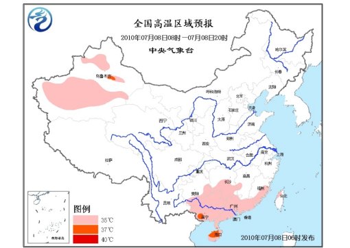 中新網(wǎng)7月8日電 中央氣象臺(tái)8日6時(shí)繼續(xù)發(fā)布高溫黃色預(yù)警,預(yù)計(jì),今天白天,貴州南部的部分地區(qū)、湖南中南部、江西中部偏西地區(qū)、福建東部、廣東、廣西、海南、臺(tái)灣西北部等地有35~38℃的高溫天氣。