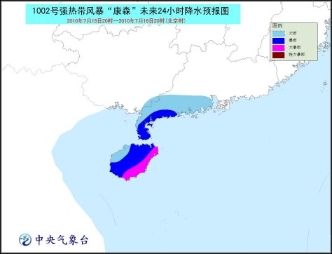 受其影響,15日晚上到16日白天,南海北部和中部、海南省及其沿海、瓊州海峽、廣東西部沿海、北部灣東部海面將有7-9級大風(fēng),“康森”中心經(jīng)過的附近海面或地區(qū)的風(fēng)力可達(dá)10-12級;海南、廣東西南部將有大到暴雨,其中海南東部的部分地區(qū)有大暴雨,局地有特大暴雨。