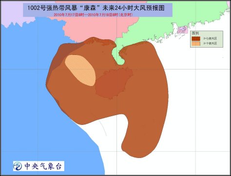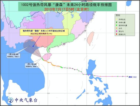 受其影響,17日白天到夜間,南海西北部、瓊州海峽、海南省及其沿海、廣東西部沿海、廣西沿海、北部灣將有7~9級大風(fēng),“康森”中心經(jīng)過的附近海面的風(fēng)力可達(dá)10~12級,北部灣部分海域陣風(fēng)可達(dá)13~14級;廣東西南部、廣西南部、海南、云南東南部將有大到暴雨,其中海南西部、廣西南部的部分地區(qū)有大暴雨。
