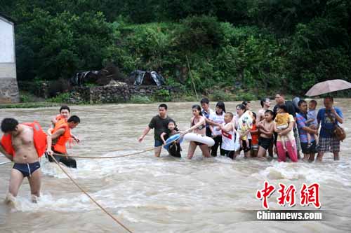 18日浙江衢州石梁鎮(zhèn)坎底村水庫因暴雨致水位突漲,18名正在水庫里休閑渡假的游客被困水庫中央,其中7人是小孩。后在衢州柯城消防架設(shè)“安全通道”下,18名游客被安全救出。