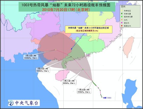 中新網(wǎng)7月20日電 據(jù)中央氣象臺(tái)網(wǎng)站消息,中央氣象臺(tái)7月20日18時(shí)繼續(xù)發(fā)布臺(tái)風(fēng)藍(lán)色預(yù)警:今年第3號(hào)熱帶風(fēng)暴“燦都”的中心,20日17時(shí)位于廣東陽江東南方大約510公里的海面上,就是北緯18.2度,東經(jīng)114.9度,中心附近最大風(fēng)力有9級(jí)(23米/秒),中心最低氣壓為990百帕。