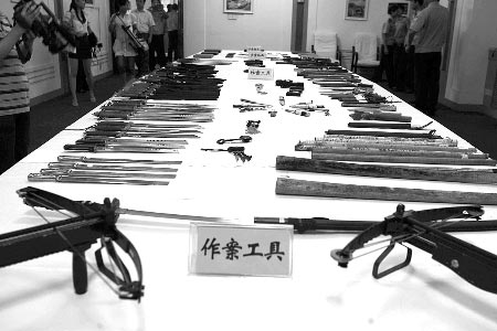 現(xiàn)場最多的作案工具還是刀,三尺長一掌寬的板刀、砍刀約40把,大小匕首近50把。在刀具旁邊擺著兩把弩,民警介紹說,弩的裝填時間很長,攜帶也不方便,但是它的射程很遠,殺傷力強,“在利益沖突比較嚴重的時候,曾有黑惡勢力團伙用弩對射”。