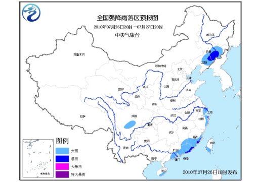 中新網(wǎng)7月26日電 據(jù)中央氣象臺(tái)消息,中央氣象臺(tái)7月26日18時(shí)繼續(xù)發(fā)布暴雨藍(lán)色預(yù)警:預(yù)計(jì),7月26日20時(shí)到7月27日20時(shí),吉林中東部、遼寧北部、四川盆地南部部分地區(qū)、浙江東部、福建東部和南部、江西南部、廣東中東部、海南南部、臺(tái)灣南部等地有大雨或暴雨,其中,浙江東部沿海、福建東部、廣東東部等地的局部地區(qū)有大暴雨;上述局地并伴有短時(shí)雷雨大風(fēng)等強(qiáng)對(duì)流天氣。