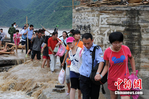 搶救突擊隊(duì)冒著洪水和山體滑坡的危險(xiǎn),沿著沖毀的道路,一邊行進(jìn)一邊開路。2公里水毀路段,整整走了3個(gè)多小時(shí)。到達(dá)旅游團(tuán)被困地點(diǎn)后,搶救突擊隊(duì)員顧不上休息,背起較小的孩子,攙扶起較大的孩子,帶領(lǐng)旅游團(tuán)隊(duì)踏上歸途。
