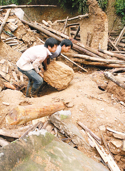 15歲的邵玉乾能撿回一條命完全得益于他的貪玩。24日上午,盡管雨大,他還是帶著小外甥到房子后面的山坡上玩,不巧,小外甥陷到泥里,全身濕透,他跑回去給拿了件衣服。剛到半山腰,突然,腳下好像地動(dòng)山搖,緊接著“卡啦卡啦”巨大的聲響,像爆炸一樣,山上的泥石流瞬間沖向?qū)γ娴纳狡拢终刍仡^沖向他這邊。他前面不遠(yuǎn)處的一排房子全倒了。他趕緊跑過(guò)去看,奶奶被泥石淤在腰部,大聲喊著救命。這時(shí),旁邊有人趕來(lái),幾人用手刨了2個(gè)多小時(shí),奶奶終于被救出。但是,邵玉乾的姐姐邵玉娟、妹妹邵玉苗,卻被埋在泥石之下。