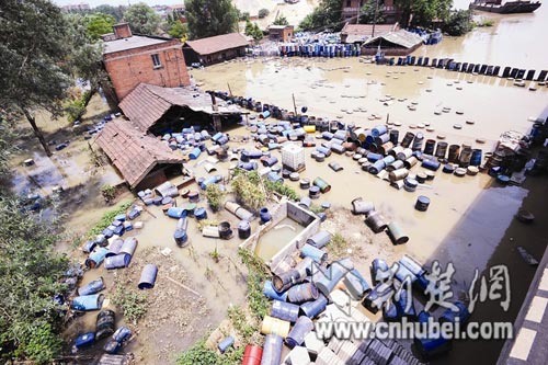 漢江長豐橋江段漢口一側一倉庫被淹,數(shù)百只化工鐵桶和塑料桶浸泡在江水中,另有數(shù)千只桶堆在江中的平臺上。昨日,記者聞訊立即向環(huán)保部門反映,東西湖區(qū)環(huán)保局連夜組織打撈。