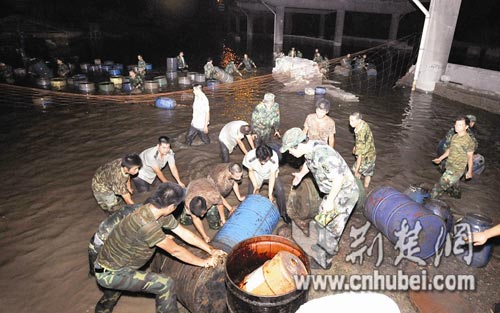 昨晚8時許,東西湖區(qū)環(huán)保局監(jiān)察大隊夏大隊長表示,接到反映后,下午立即展開了調查,發(fā)現(xiàn)部分桶內還有液態(tài)物質。東西湖區(qū)政府立即組織500多名民兵預備役人員,配合化工桶倉庫的業(yè)主,挑燈夜戰(zhàn)連續(xù)打撈和轉移,包括江中平臺上的化工桶在內,共3000只化工桶將不會在江中過夜;與此同時,區(qū)環(huán)保監(jiān)測站對桶內液態(tài)物質進行化驗,同時對浸泡化工桶的江水,每隔兩小時取一次樣進行化驗,密切監(jiān)測該江段的水質情況。