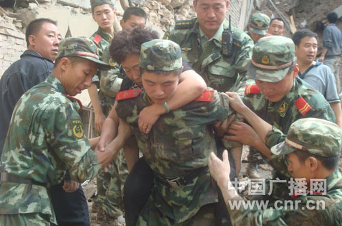 黑夜中,不少戰(zhàn)士的手和腳被埋在泥石中的鋼筋、瓦礫刺破,鮮血直流,官兵心中只有一個(gè)念頭:對廢墟下每個(gè)可能幸存的生命,不拋棄,不放棄!一名婦女被救出了,頭上血流不止,戰(zhàn)士郭永寬撕開自己的背心替他包扎。戰(zhàn)士田維宇見到一個(gè)被救的老人凍得發(fā)抖,脫下自己身上僅有的一件衣服給她穿上。班長宋楠楠長時(shí)間用手挖掘尸體,手劃破了,鮮血直流,他顧不上包扎連續(xù)戰(zhàn)斗。十幾個(gè)小時(shí)沒進(jìn)一粒食,沒喝一口水,沒合一下眼,50名參戰(zhàn)官兵就是憑著100條手臂,在8日第一時(shí)間從廢墟中搶救出32條鮮活的生命。