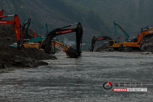 隨著入口擴大,搶險隊伍同時在岷江右岸(改道后的河道)鋪設(shè)了一條150米長的進站道,以利重型機械通過,并準(zhǔn)備在明后天對改道后的岷江河道進行截流。