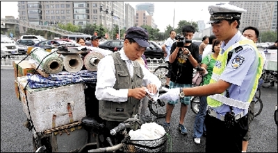 昨天上午9點(diǎn),記者在東單路口看到,8名民警“把守”在路口4個(gè)方向,由于正值上班高峰,路口騎車人較多,大部分人能等待紅燈,幾名想“闖關(guān)”的騎車人被民警和協(xié)管員攔住。市民小陳騎電動自行車載人,被執(zhí)勤民警攔下并處以罰款20元。記者注意到,民警處理的多是自己加裝動力裝置的三輪車!白孕屑友b動力裝置很危險(xiǎn)!泵窬f,行人、非機(jī)動車的違法行為主要有騎車帶人、逆行、闖紅燈等。昨天上午兩個(gè)小時(shí)內(nèi),僅東單路口一處,民警就處罰了20多起行人、非機(jī)動車的違法行為。