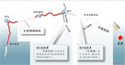 連日來,受大貨超載、車多、修路等因素影響,京藏高速重現(xiàn)大擁堵,上萬車輛滯留,內(nèi)蒙古境內(nèi)堵車路段更是長達120公里。與京外情況相比,110國道西關(guān)環(huán)島至延慶段的進京和出京方向交通都較為通暢,未現(xiàn)擁堵現(xiàn)象。