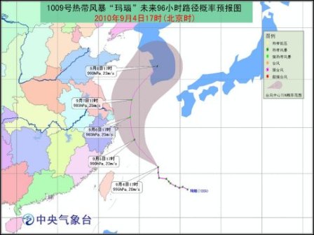 今年第9號熱帶風暴“瑪瑙”的中心9月4日17時位于浙江象山東南方大約680公里的洋面上,就是北緯25.7度,東經127.3度,中心附近最大風力有8級(20米/秒),中心氣壓995hPa。