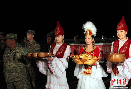 在奧塔爾市火車站站臺上舉行的簡樸而隆重的歡迎儀式上,用中、俄兩種文字書寫的“熱烈歡迎‘和平使命-2010’聯(lián)合反恐軍事演習中方參演部隊”的橫幅格外醒目,哈方軍樂隊高奏中、哈兩國國歌,3位哈薩克斯坦盛裝少女手捧當?shù)靥厣拿谰啤⒚朗,獻給風塵仆仆的中方參演官兵。隨后,站臺另一側(cè),中方參演部隊列車第一車隊攜行裝備,也在緊張有序地進行卸載。