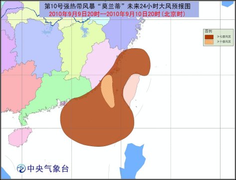 受熱帶風(fēng)暴和西南季風(fēng)共同影響,9月9日20時到10日20時,巴士海峽、巴林塘海峽、臺灣海峽、南海北部、臺灣西部和南部沿海、福建中南部沿海、廣東沿海將有7-8級大風(fēng),“莫蘭蒂”中心經(jīng)過的附近海面或地區(qū)的風(fēng)力有9-11級,陣風(fēng)可達(dá)12-13級;浙江東部沿海和南部、福建、廣東中東部和西南部、廣西南部、海南、臺灣等地有大雨或暴雨,其中,福建東南部、臺灣南部等地局部有大暴雨。