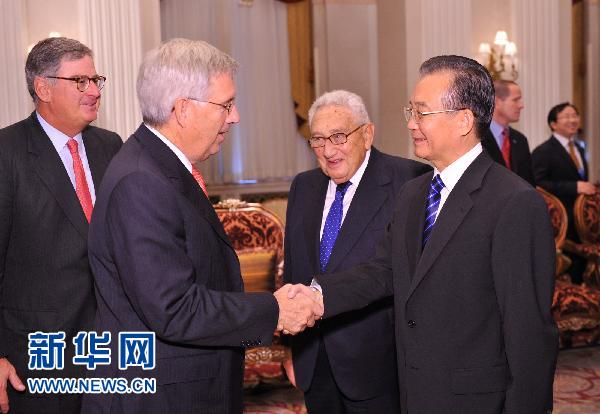 當(dāng)?shù)貢r(shí)間9月22日上午,在紐約華爾道夫飯店一間寬敞的會(huì)議室里,溫家寶總理望著坐在身旁的基辛格,以40多年來(lái)中美關(guān)系的發(fā)展入題,與美國(guó)企業(yè)、金融和學(xué)術(shù)界一些著名人士展開(kāi)座談和交流。