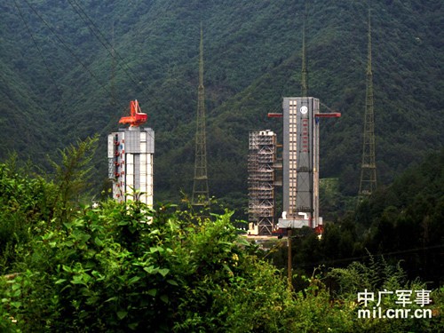 車行一個小時左右,我們終于到達了向往已久的西昌衛(wèi)星發(fā)射中心。由于事先沒有經(jīng)過有關(guān)部門批準,此次我們不能進入發(fā)射中心核心區(qū)域進行采訪,只能乘車沿著窄窄的彎曲山路,圍繞著群山環(huán)抱下的發(fā)射場,也就是2號發(fā)射平臺和整裝待發(fā)的“嫦娥二號”遠遠地參觀一下。但即使這樣,我們還是能夠清晰地看到2號、3號固定發(fā)射塔和總裝廠房,呈三角形巍然屹立于山谷中。