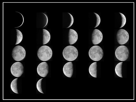 月球位于日、地之間時(shí)叫做“朔”,月球暗的半個(gè)球朝向地球,我們看不到它。朔之后的一兩天,鐮刀狀的新月在傍晚西方的天空中露面,凸面向著落日的方向。以后月球相對(duì)于太陽(yáng)逐漸向東移動(dòng),亮的部分日益擴(kuò)展。五六天以后成了半圓形,這時(shí)的月相稱為“上弦”,日落時(shí)月球在天子午線附近。再經(jīng)過(guò)7天,便到了“望”(滿月),月球與太陽(yáng)遙遙相望,我們看到的是一輪明月于傍晚東升,在晨曦中西落,將黑夜照耀得如同白晝一般。滿月以后,圓輪的西部日益虧缺。到“下弦”時(shí),呈半圓形,月球到半夜才升起。和上弦月相反,下弦月是東邊半個(gè)圓被照亮。下弦以后,半圓繼續(xù)虧缺,成為黎明前掛在東方天空的一絲殘?jiān)隆K鷣?lái)愈接近太陽(yáng),終于跑到和太陽(yáng)相同的方向,朔又來(lái)臨了。