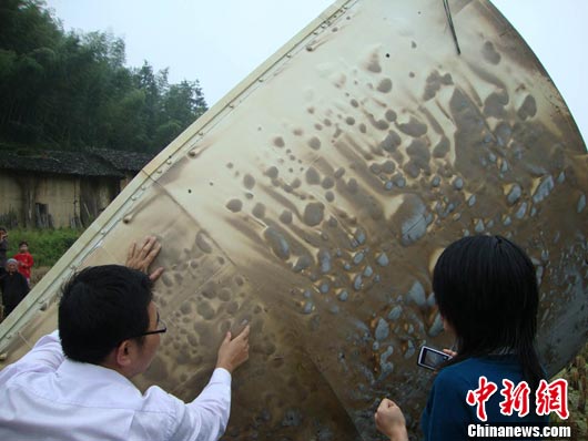 此次衛(wèi)星整流罩分別墜落在遂川縣茶鄉(xiāng)湯湖鎮(zhèn)的南屏、橫圳兩個(gè)村,一處距湯湖鎮(zhèn)政府以北南屏村1公里處的農(nóng)田里,農(nóng)田砸出了一個(gè)大坑,坑深達(dá)1.5米;另一處距鎮(zhèn)政府橫圳7公里處。
