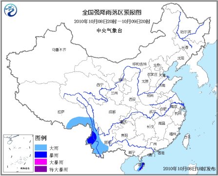 10月8日20時到9日20時,海南中東部、雷州半島東南部、云南西部、西藏東南部等地有大雨或暴雨,其中海南東南部的局部地區(qū)有大暴雨;上述地區(qū)局部伴有短時雷雨大風(fēng)等強(qiáng)對流天氣。