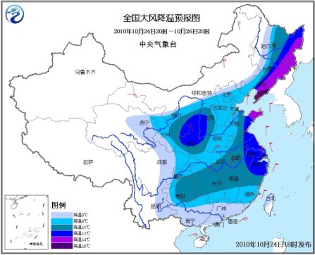 中央氣象臺(tái)今天18時(shí)繼續(xù)發(fā)布寒潮藍(lán)色預(yù)警。預(yù)計(jì),24日20時(shí)至26日20時(shí),西北地區(qū)東部、內(nèi)蒙古南部、東北大部、華北、黃淮、江淮、江漢、江南、華南、西南地區(qū)東部等地將出現(xiàn)6~12℃降溫,其中,黑龍江東南部、吉林東部、遼寧東部、山東半島等地的部分地區(qū)降溫幅度可達(dá)14~16℃;甘肅大部、青海中東部、寧夏等地將有雨夾雪或小到中雪,其中,甘肅中部、青海東北部等地局地有大到暴雪。