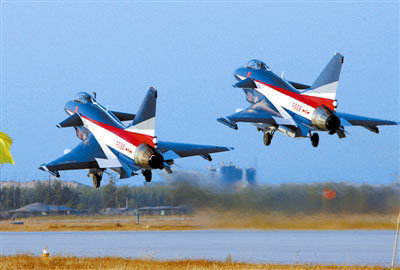 經(jīng)總部批準,八一飛行表演隊于2009年6月?lián)Q裝殲—10表演機。為增加表演機的主題性、威猛性、觀賞性、辨識性,空軍委托中央美術(shù)學院設計團隊為其量身訂制了全新涂裝。披掛一新的殲—10表演機將在珠海航展上以六機編隊的全新陣容,獻上精彩的視覺盛宴。