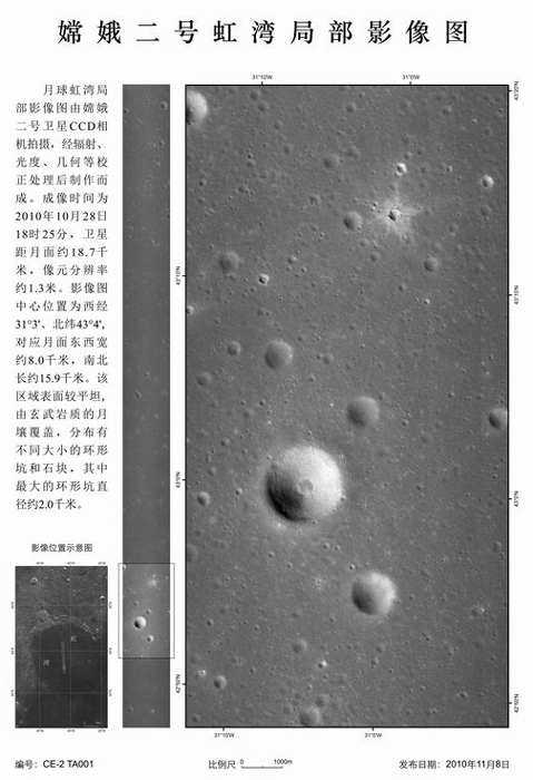 據(jù)中央電視臺報道,首次公布的月球虹灣地區(qū)局部影像圖是一張黑白照片。據(jù)國防科技工業(yè)局有關(guān)負(fù)責(zé)人介紹,該影像成像時間為10月28日18時,是衛(wèi)星距離月面大約18.7公里地方拍攝獲取。影像圖的傳回,標(biāo)志著嫦娥二號任務(wù)所確定的六個工程目標(biāo)已經(jīng)全部實(shí)現(xiàn)。這意味著探月工程二期“嫦娥二號”工程任務(wù)取得圓滿成功。