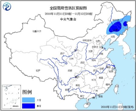 11月11日20時到12日20時,內(nèi)蒙古東部偏南地區(qū)、遼寧北部、吉林大部、黑龍江東南部等地有大雪(5~9毫米),其中,內(nèi)蒙古東部偏南地區(qū)、吉林中部、黑龍江東南部等地的部分地區(qū)有暴雪(10~20毫米)。