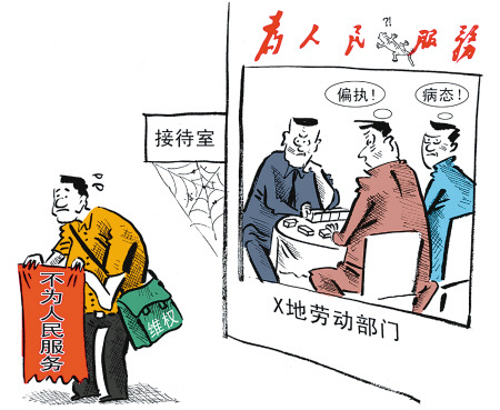 曾在無錫新區(qū)某公司工作的周力向當(dāng)?shù)貏趧?dòng)保障監(jiān)察大隊(duì)實(shí)名舉報(bào),要求公司補(bǔ)償加班費(fèi)。但勞保監(jiān)察隊(duì)負(fù)責(zé)人稱,從勞動(dòng)的相關(guān)法律法規(guī)來看,想要從勞動(dòng)部門解決此事,已經(jīng)很難。為此,周力給勞動(dòng)部門送上一幅“不為人民服務(wù)”的錦旗。(現(xiàn)關(guān)報(bào)道見今日本報(bào)8版)