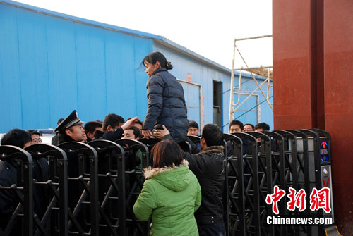 在雙方僵持不下的情況下,這名記者想翻門進(jìn)入,但遭到數(shù)名看大門人的人墻式的阻攔。 經(jīng)過(guò)反復(fù)僵持、協(xié)商,終于有一名記者被允許翻門進(jìn)入。