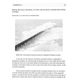 中新網(wǎng)11月9日電 據(jù)外交部網(wǎng)站消息,2012年11月5日,羅馬尼亞主流媒體《經(jīng)濟(jì)學(xué)家報(bào)》和《九點(diǎn)鐘報(bào)》分別用羅、英兩種文字全文刊登中國外交部副部長宋濤署名文章《為了中歐關(guān)系的美好未來》。