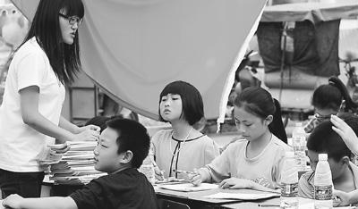 4月25日,蘆山縣地震災(zāi)區(qū)的孩子們?cè)谥驹刚呓⒌呐R時(shí)帳篷學(xué)校里補(bǔ)習(xí)功課。