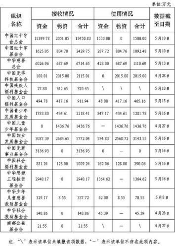 截至5月16日,中國紅十字會總會和14家在民政部登記的社會組織向民政部報送了救災(zāi)捐贈統(tǒng)計數(shù)據(jù)。