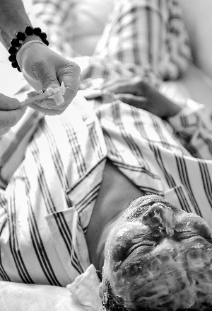5日,從事故中脫險的44歲漢子夏維剛躺在市中心醫(yī)院334號病房內(nèi),灼傷的臉上涂滿藥膏。大火發(fā)生時夏維剛在安全地帶,返回火場救人時才被燙傷,他們抬出的工友有30多個。