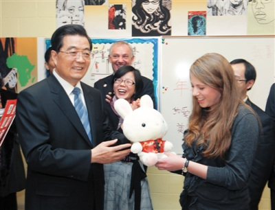 胡錦濤也選擇了一所中學(xué)參觀——芝加哥佩頓中學(xué),并向中文班學(xué)生贈(zèng)送新春禮物,一個(gè)白兔玩偶。在中美發(fā)表的聯(lián)合聲明中,雙方重申致力于建設(shè)二十一世紀(jì)積極合作全面的中美關(guān)系。