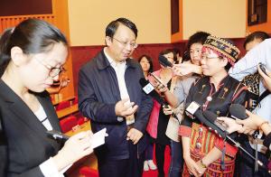 11月27日上午,全國(guó)人大常委會(huì)副秘書長(zhǎng)沈春耀在海口宣講十八屆三中全會(huì)精神。圖為他和五指山市黎族干部交流如何貫徹十八屆三中全會(huì)精神提高農(nóng)民收入。本報(bào)記者 王凱 攝