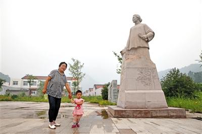 昨日,密云縣張家墳村,鄧玉芬的孫媳婦帶著孫女在鄧玉芬雕像前。新京報(bào)記者 王遠(yuǎn)征 攝