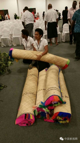 一名斐濟(jì)原住民將草席獻(xiàn)至習(xí)大大面前,另一人手持鯨魚(yú)牙向習(xí)大大致祝福語(yǔ)并獻(xiàn)上鯨魚(yú)牙。咦,不是剛剛獻(xiàn)過(guò)一次嗎?不管那么多了,接過(guò)鯨魚(yú)牙再次轉(zhuǎn)交給斐濟(jì)禮賓官,禮賓官向獻(xiàn)禮人拍掌并表示感謝。之后,斐濟(jì)原住民將草席撤下。