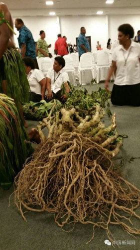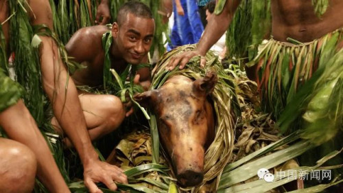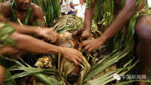 喝完卡瓦汁,斐濟(jì)原住民又把烤豬、芋頭什么的抬上來(lái)啦,一人還上前致祝福語(yǔ)。習(xí)大大點(diǎn)頭致意。斐濟(jì)禮賓官代表習(xí)大大接受獻(xiàn)品并致謝。然后,原住民將食物抬下。