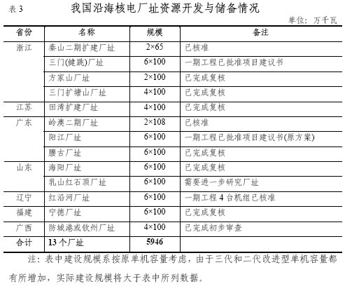 經(jīng)過(guò)多年努力,我國(guó)已儲(chǔ)備了一定規(guī)模的核電廠址資源。除已建和在建工程外,在沿海地區(qū)開(kāi)展前期工作已較充分的廠址還有5000多萬(wàn)千瓦,具體廠址資源開(kāi)發(fā)與儲(chǔ)備情況見(jiàn)表3。