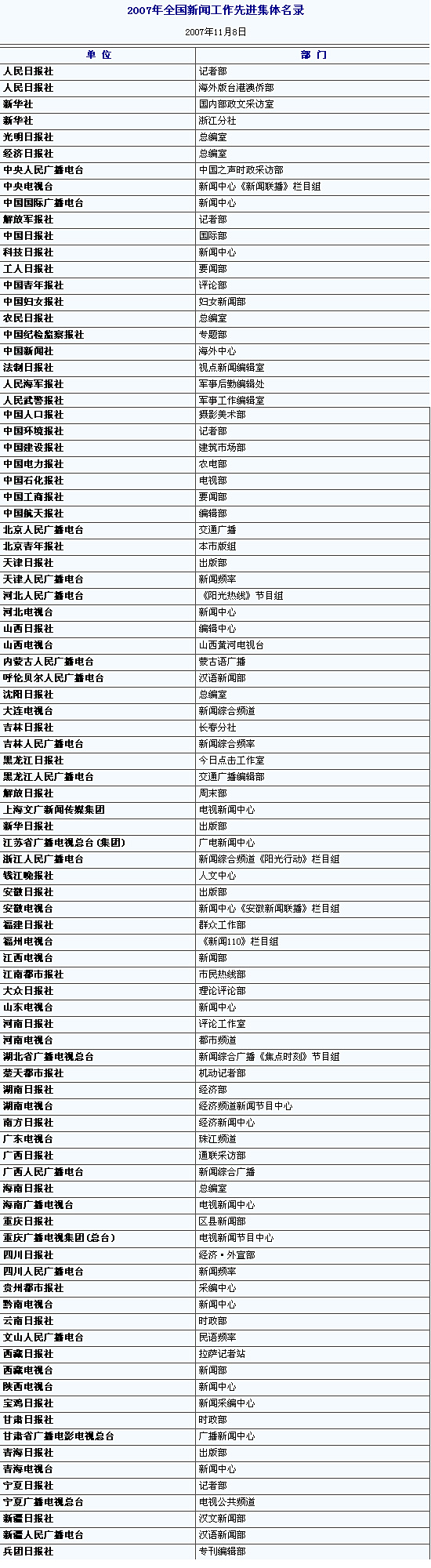 2007年全國(guó)新聞工作先進(jìn)集體名錄