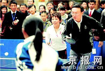 今天(二十五日)是外交部今年第二次公眾開放日,今天的主題是“中國外交與北京奧運”。中午11時20分,外交部長楊潔篪和奧運冠軍鄧亞萍揮拍切磋乒乓球藝,精湛的“表演”贏得在場公眾陣陣喝彩。