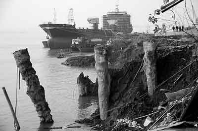 昨日,長(zhǎng)江蕪湖段江堤發(fā)生坍塌的事故,引起多方關(guān)注。記者昨日再次趕到坍塌現(xiàn)場(chǎng)時(shí),發(fā)現(xiàn)原塌方處又再次出現(xiàn)大面積坍塌,受損失的兩家船廠正將臨近岸邊上的設(shè)備和物資緊急后移。與此同時(shí),相關(guān)專家也已趕到現(xiàn)場(chǎng),研究制定處理方案。