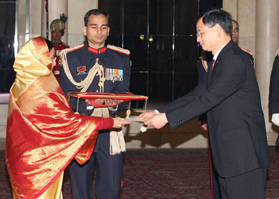 中新網(wǎng)12月19日電 據(jù)中國外交部網(wǎng)站消息:中國新任駐印度特命全權(quán)大使張炎18日下午向印度共和國總統(tǒng)普拉蒂巴•帕蒂爾遞交了國書。