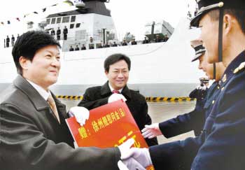 1月27日,海軍東海艦隊(duì)某軍港彩旗招展,軍樂(lè)激揚(yáng),一艘新型戰(zhàn)艦懸掛滿旗,威武莊嚴(yán),海軍“徐州艦”入列命名授旗儀式在這里隆重舉行。南京軍區(qū)副政委兼海軍東海艦隊(duì)政委徐建中中將,海軍東海艦隊(duì)參謀長(zhǎng)王志國(guó)少將、政治部主任高長(zhǎng)清少將,駐舟山部隊(duì)首長(zhǎng)包裕平、劉蘇閩少將,舟山市領(lǐng)導(dǎo)鐘達(dá)、周偉江,我市領(lǐng)導(dǎo)曹新平、王昊等出席入列命名授旗儀式。