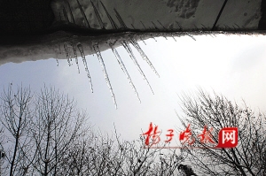 很冷,雪水結(jié)成冰凌,在陽光照射下慢慢融化。