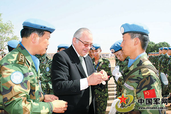 按照聯(lián)合國慣例,為維和部隊(duì)授勛一般都是在任務(wù)期滿6個(gè)月時(shí)舉行。鑒于中國維和部隊(duì)在完成任務(wù)過程中表現(xiàn)出色,聯(lián)蘇團(tuán)決定破例提前兩個(gè)月為所有435名中國維和官兵頒發(fā)“和平榮譽(yù)勛章”。