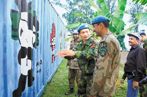 為了宣傳奧運(yùn),維和官兵在營院里面制作了各種各樣的奧運(yùn)標(biāo)志。充作庫房的集裝箱上噴繪的是福娃的形象,草坪中的一片空地上,則是官兵們用簡易器材做成的五環(huán)圖案和“Beijing2008”字樣。作戰(zhàn)組參謀張寶軍向前來參觀的外國友人一一作著介紹,還特別介紹了奧運(yùn)會(huì)會(huì)徽標(biāo)志代表的里程碑、承諾、形象、美麗、英雄、精神、邀請等七層含義。當(dāng)?shù)亟逃齾f(xié)會(huì)的阿里特邊聽邊記,還將中國印和五個(gè)福娃的形狀畫了下來。聯(lián)剛團(tuán)志愿者部門的卡爾松則連聲說,要調(diào)整假期到北京去看奧運(yùn)會(huì)比賽……