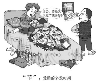 “節(jié)”即節(jié)日。調(diào)查表明,節(jié)日最容易發(fā)生賄賂犯罪,有約一半以上的賄賂犯罪是在節(jié)假日發(fā)生的。在“禮尚往來(lái)”幌子的掩蓋下,各種錢權(quán)交易最容易盛行。群眾中流傳一句順口溜:“干部廉不廉,重點(diǎn)看過(guò)年”!肮(jié)”已成為一些官員受賄的多發(fā)時(shí)期。